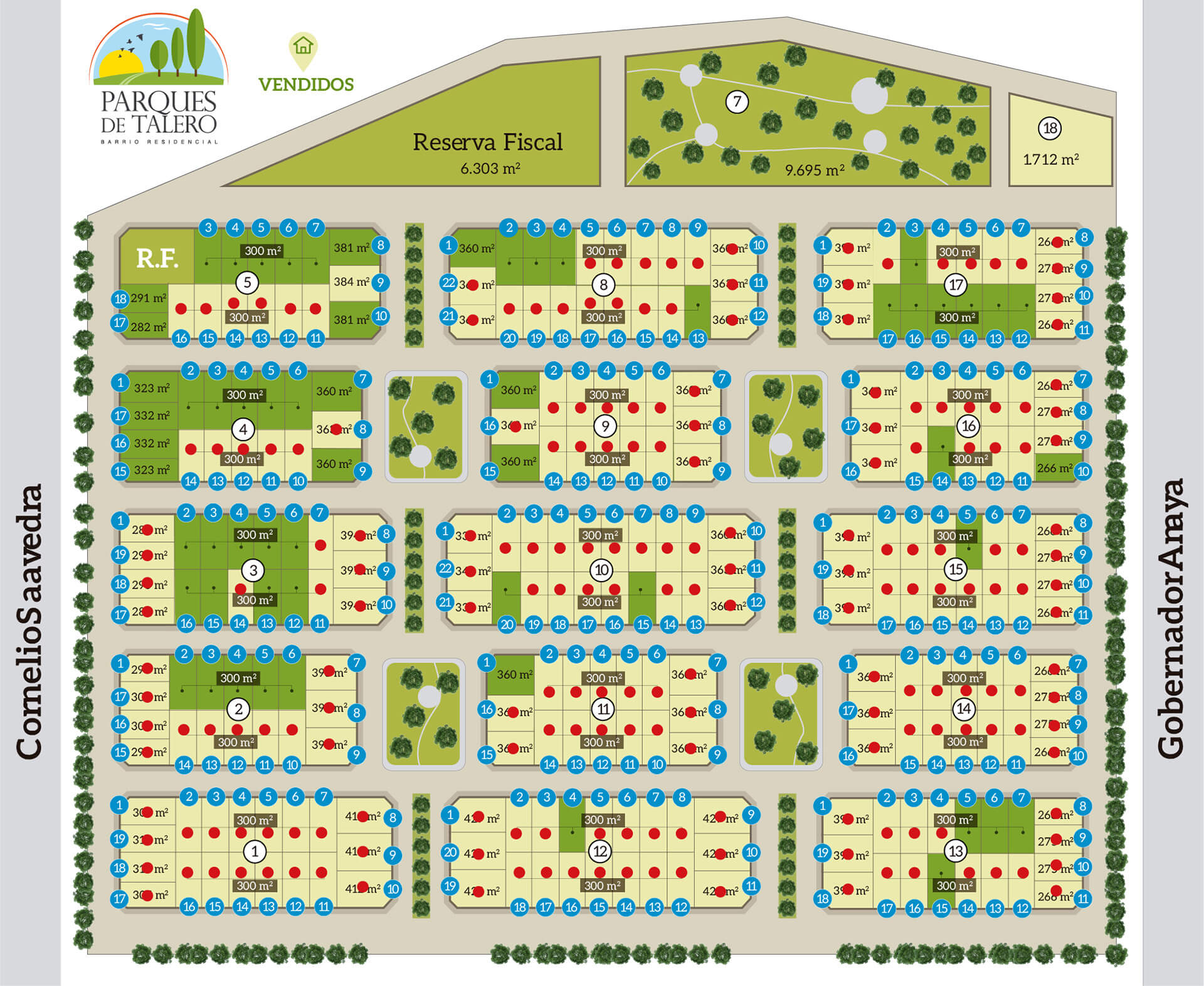 Parques de Talero cuenta con 280 lotes, desde 300 m2, con conexión a todas las redes de servicios públicos (agua, gas, electricidad y cloacas).